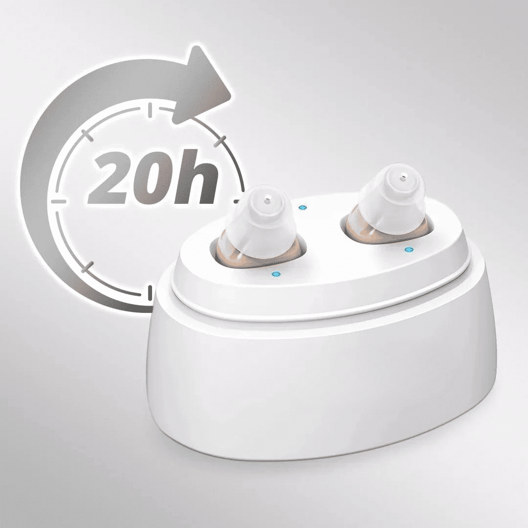 Each charge provides up to 20 hours of use. The charging case can recharge the hearing aids about 4–5 times before needing to be recharged itself.