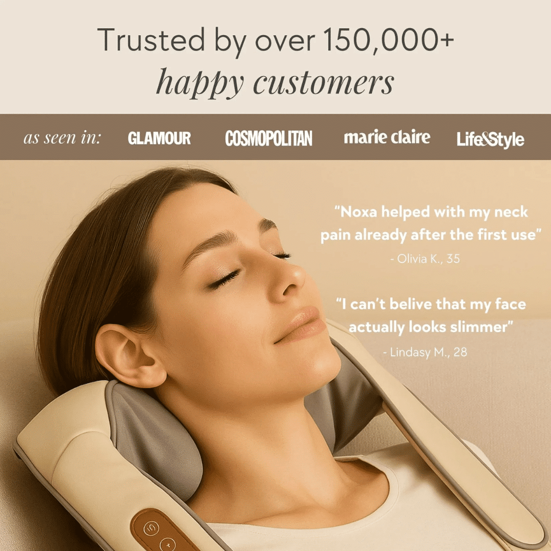 Noxa Massager is a cordless neck and shoulder massager that delivers deep‑kneading, “hand‑like” relief wherever you are. It combines adjustable intensity and soothing heat to melt away muscle tension, ease stiffness from long hours at a desk, and support better circulation.