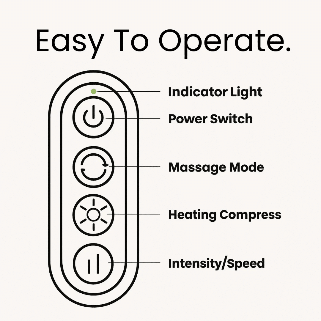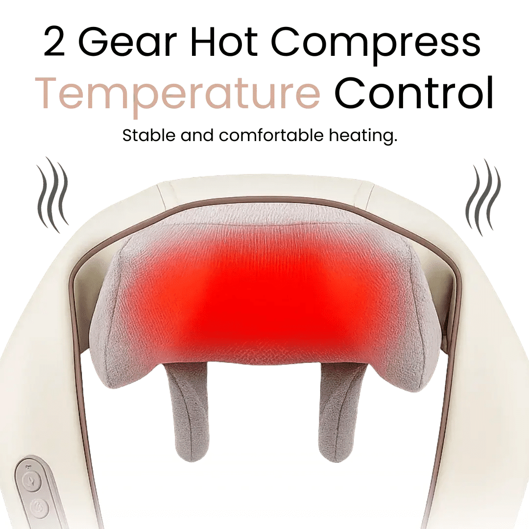 Users choose from several intensity settings (gentle, moderate, intense) and massage modes (clockwise, counterclockwise, deep-tissue) to match their comfort level and the severity of their tension. The built‑in heat function adds gentle warmth, which supports blood flow and lymphatic drainage, helping fluid buildup disperse and enhancing the overall relaxing effect.
