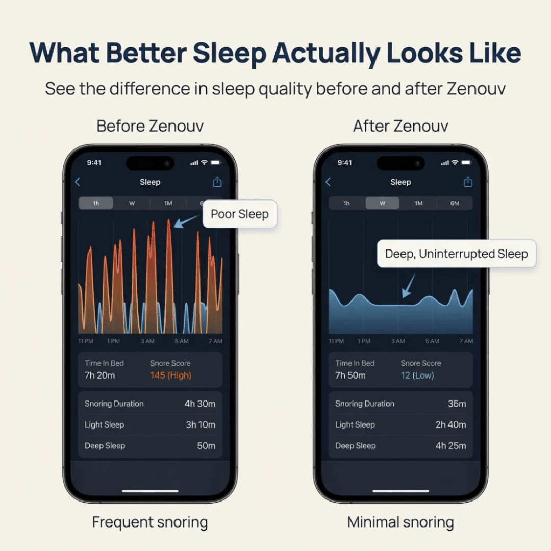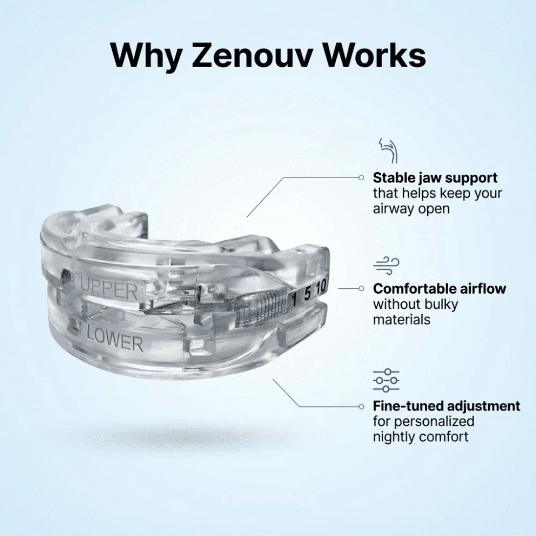 The Zenouv Mouthpiece is based on the science of sleep physiology and the common causes of snoring. Snoring usually happens when the muscles around the airway relax during sleep, causing it to narrow. This narrowing creates turbulence as air passes through, making the tissues in the throat vibrate and produce the snoring sound.